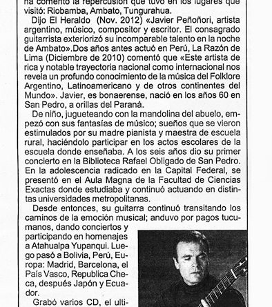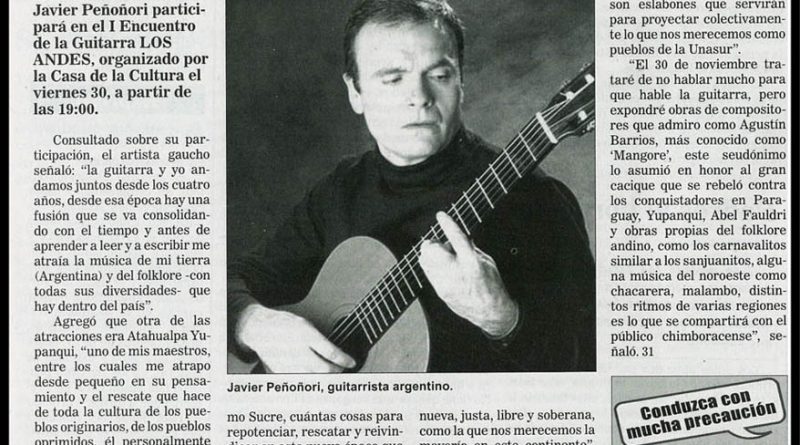 Leer másJavier Peñoñori – Gira por Ecuador TIEMPO ARGENTINO El guitarrista y escritor argentino, de vasta trayectoria nacional e internacional, recorre